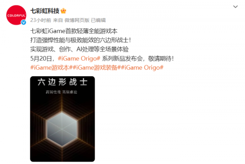 七彩虹发布会定档5月20日,iGame Origo 系列轻薄游戏本即将面市!